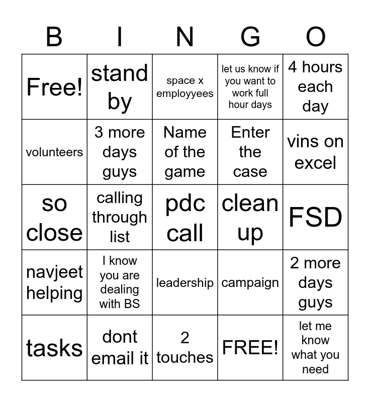This bingo card has 25 words: I know you are dealing with BS, 2 touches, Name of the game, tasks, 4 hours each day, Free!, volunteers, stand by, clean up, leadership, Enter the case, so close, campaign, 2 more days guys, 3 more days guys, let me know what you need, FSD, space x employyees, vins on excel, calling through list, pdc call, dont email it, navjeet helping, let us know if you want to work full hour days and FREE!.