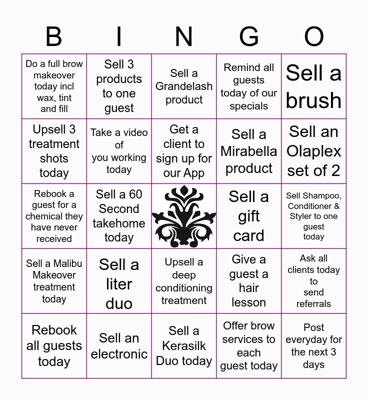 This bingo card has a free space and 24 words: Sell a liter duo, Sell an electronic, Get a client to sign up for our App, Rebook all guests today, Sell a brush, Do a full brow makeover today incl wax, tint and fill, Upsell 3 treatment shots today, Sell 3 products to one guest, Sell a gift card, Upsell a deep conditioning treatment, Sell a Mirabella product, Rebook a guest for a chemical they have never received, Give a guest a hair lesson, Ask all clients today to send referrals, Take a video of you working today, Offer brow services to each guest today, Sell Shampoo, Conditioner & Styler to one guest today, Sell a Grandelash product, Sell an Olaplex set of 2, Sell a 60 Second takehome today, Post everyday for the next 3 days, Sell a Malibu Makeover treatment today, Remind all guests today of our specials and Sell a Kerasilk Duo today.