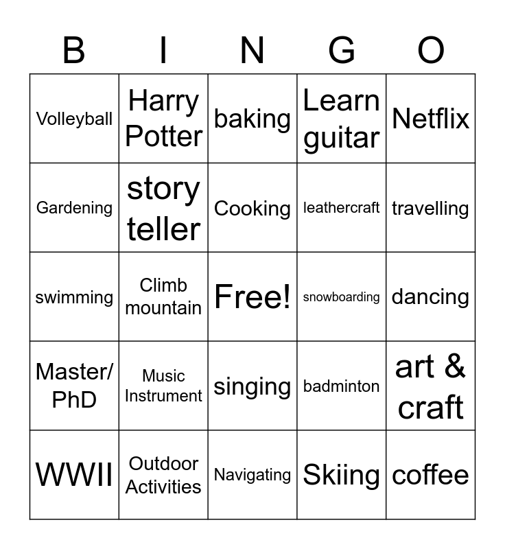 This bingo card has a free space and 24 words: Music Instrument, Outdoor Activities, Cooking, WWII, Netflix, Volleyball, Gardening, Harry Potter, snowboarding, singing, leathercraft, swimming, badminton, art & craft, story teller, Skiing, dancing, baking, travelling, Climb mountain, coffee, Master/ PhD, Learn guitar and Navigating.