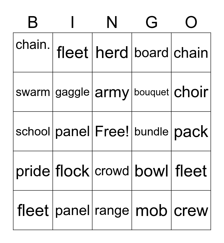This bingo card has a free space and 24 words: flock, panel, army, fleet, chain, chain., swarm, fleet, bundle, crowd, bouquet, school, bowl, fleet, gaggle, mob, pack, herd, choir, panel, crew, pride, board and range.