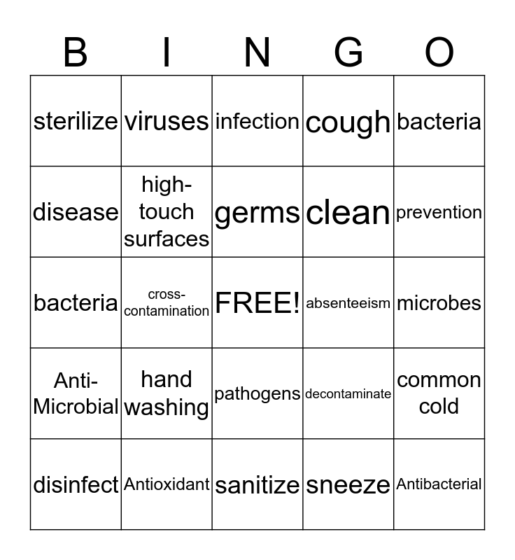 This bingo card has a free space and 25 words: hand washing, sanitize, germs, disinfect, bacteria, sterilize, disease, viruses, absenteeism, pathogens, clean, bacteria, decontaminate, common cold, high-touch surfaces, flu bugs, microbes, infection, prevention, cross-contamination, Antibacterial, Antioxidant, Anti-Microbial, cough and sneeze.