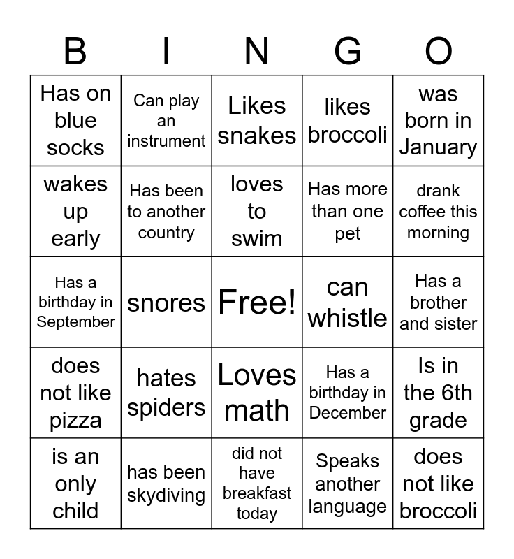 This bingo card has a free space and 24 words: hates spiders, has been skydiving, loves to swim, is an only child, was born in January, Has on blue socks, wakes up early, Can play an instrument, can whistle, Loves math, Has more than one pet, Has a birthday in September, Has a birthday in December, Is in the 6th grade, Has been to another country, Speaks another language, Has a brother and sister, Likes snakes, drank coffee this morning, snores, does not like broccoli, does not like pizza, likes broccoli and did not have breakfast today.