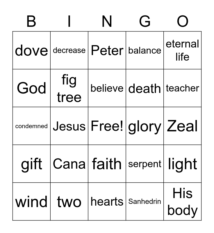 This bingo card has a free space and 29 words: wind, sanctification, Jesus, The Lamb of God, dove, Peter, fig tree, Cana, glory, two, Zeal, His body, hearts, Sanhedrin, teacher, regeneration, faith, gift, eternal life, condemned, serpent, total depravity, death, God, balance, decrease, light, believe and name.