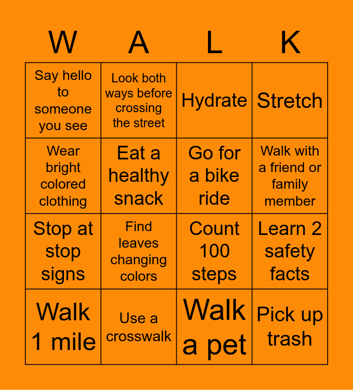 This bingo card has 16 words: Walk 1 mile, Use a crosswalk, Hydrate, Stretch, Wear bright colored clothing, Look both ways before crossing the street, Count 100 steps, Learn 2 safety facts, Say hello to someone you see, Eat a healthy snack, Walk a pet, Walk with a friend or family member, Stop at stop signs, Find leaves changing colors, Go for a bike ride and Pick up trash.