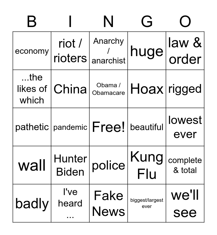 This bingo card has a free space and 27 words: Kung Flu, China Virus, Hoax, Fake News, ...the likes of which, Anarchy / anarchist, riot / rioters, wall, beautiful, complete & total, pathetic, huge, badly, I've heard ..., rigged, unbelievably, China, Obama / Obamacare, Hunter Biden, economy, lowest ever, biggest/largest ever, pandemic, we'll see, police, law & order and tax / taxes.