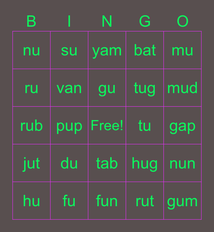 This bingo card has a free space and 24 words: du, fu, gu, hu, mu, nu, ru, su, tu, tab, tug, rub, hug, nun, van, rut, gap, yam, mud, pup, gum, jut, bat and fun.
