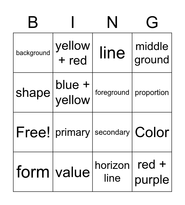 This bingo card has 20 words: Color, space, line, texture, form, shape, value, background, Free!, yellow + red, primary, secondary, blue + yellow, red + purple, foreground, self-portrait, proportion, middle ground, horizon line and neutral.
