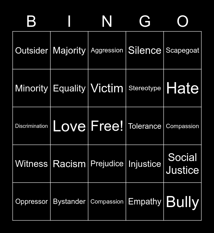This bingo card has a free space and 24 words: Racism, Bystander, Victim, Oppressor, Scapegoat, Outsider, Minority, Majority, Tolerance, Prejudice, Stereotype, Discrimination, Injustice, Social Justice, Equality, Empathy, Compassion, Aggression, Hate, Love, Bully, Witness, Silence and Compassion.