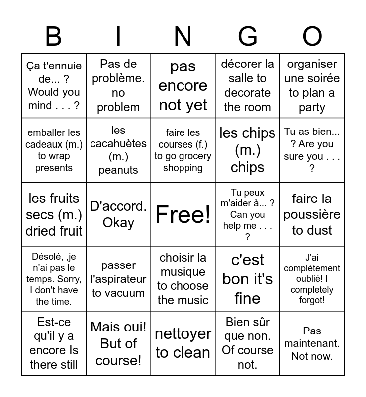 This bingo card has a free space and 35 words: les amuse-gueules snacks, les biscuits (m.) cookies, les bonbons (m.) sweets/candy, les cacahuètes (m.) peanuts, choisir la musique to choose the music, décorer la salle to decorate the room, emballer les cadeaux (m.) to wrap presents, envoyer les invitations (f.) to send the invitations, faire les courses (f.) to go grocery shopping, faire le ménage to do housework, les fruits secs (m.) dried fruit, organiser une soirée to plan a party, ranger la maison to tidy up the house, une soirée costumée costume party, Ça t'ennuie de... ? Would you mind . . . ?, Tu peux m'aider à... ? Can you help me . . . ?, Bien sûr que non. Of course not., D'accord. Okay, Désolé, ,je n'ai pas le temps. Sorry, I don't have the time., Pas maintenant. Not now., c'est bon it's fine, Est-ce qu'il y a encore Is there still, J'ai complètement oublié! I completely forgot!, Mais oui! But of course!, pas encore not yet, Tu as bien... ? Are you sure you . . . ?, Tu as déjà... ? Did you already . . . ?, Tu as pensé à... ? Have you thought of . . . ?, les chips (m.) chips, faire la poussière to dust, Je dois d'abord... First I have to..., nettoyer to clean, passer l'aspirateur to vacuum, Pas de problème. no problem and évidemment obviously.