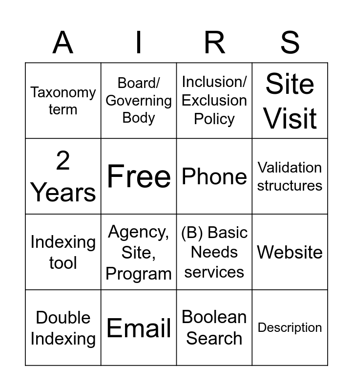 This bingo card has 16 words: Email, Website, Inclusion/ Exclusion Policy, Taxonomy term, Indexing tool, Board/ Governing Body, (B) Basic Needs services, Boolean Search, 2 Years, Free, Double Indexing, Site Visit, Agency, Site, Program, Validation structures, Phone and Description.
