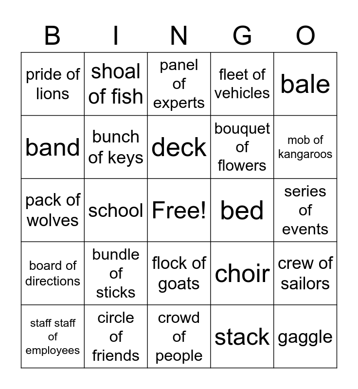 This bingo card has a free space and 35 words: army, chest, range, bunch of keys, flock of goats, fleet of vehicles, band, herd of deer, deck, forest, pack of wolves, bale, bowl, swarm of bees, pride of lions, bed, stack, school, board of directions, gaggle, choir, staff staff of employees, crew of sailors, circle of friends, panel of experts, mob of kangaroos, swarm of bees, bunch of keys, bouquet of flowers, series of events, fleet of vehicles, crowd of people, bundle of sticks, shoal of fish and chain of islands.