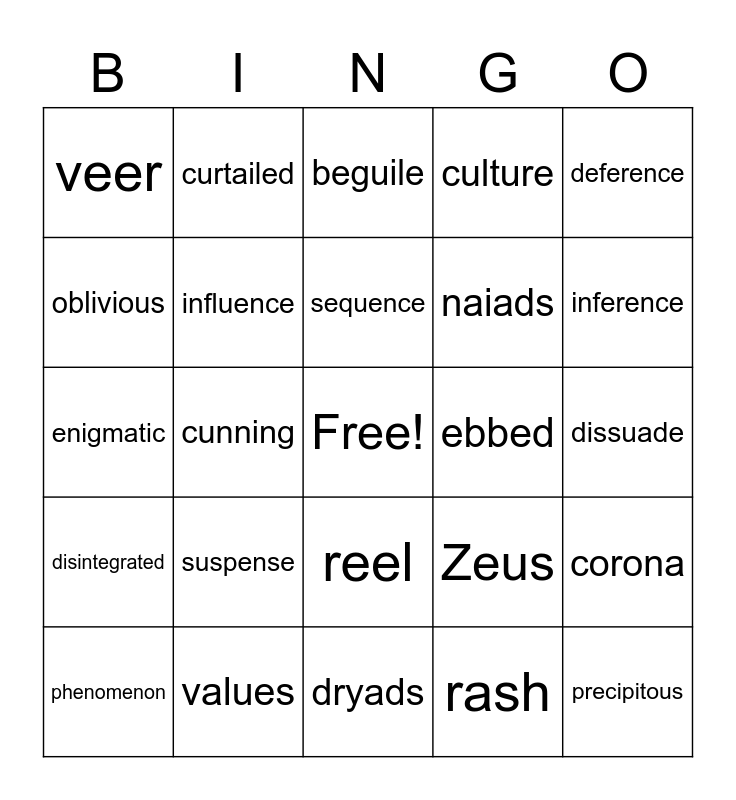 This bingo card has a free space and 27 words: Zeus, Hera, naiads, dryads, oblivious, beguile, curtailed, disintegrated, ebbed, corona, enigmatic, culture, phenomenon, values, inference, contemporary, influence, sequence, suspense, veer, dissuade, rash, cunning, precipitous, reel, deference and sustain.