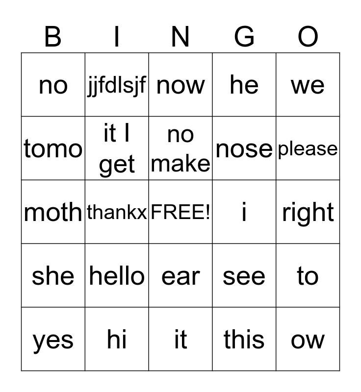 This bingo card has a free space and 24 words: hello, hi, no make, yes, we, no, tomo, jjfdlsjf, i, ear, nose, moth, see, to, it I get, this, right, now, please, thankx, ow, she, he and it.