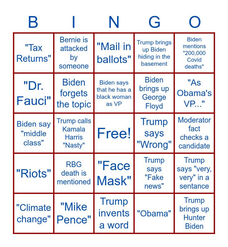This bingo card has a free space and 49 words: "Come on man!", Trump brings up Hunter Biden, "Voter fraud", Trump invents a word, RBG death is mentioned, Climate change is mentioned by Biden, Bernie is attacked by someone, Trump says "Sleepy Joe", "Dr. Fauci", Trump breathes into the mic, Biden forgets the topic, Trump brings up Biden hiding in the basement, Trump says "very, very" in a sentance, Trump says "Fake news", "Few bad apples", "Radical left", Biden says that he has a black woman as VP, Trump says "Wrong", "China Virus", Biden mentions "200,000 Covid deaths", Trump calls Kamala Harris "Nasty", "Obama", "Tax Returns", Biden brings up George Floyd, "Crooked Hillary", "As Obama's VP...", "Climate change", "The Wall", "Face Mask", "Riots", "Antifa", Biden brings up Jill being a teacher, Biden has a brain freeze, "Vaccine", "Mike Pence", Trump questions if Biden is on drugs, "Travel Ban", A Trump Tweet is mentioned, Moderator fact checks a candidate, "Kamala Harris", Israel/United Arab Peace Treaty is Mentioned, "Jobs", Trump says "Russia HOAX", A candidate mentions impeachment, Biden say "middle class", "Mail in ballots", "Economy", "Black People" and "Ukraine".