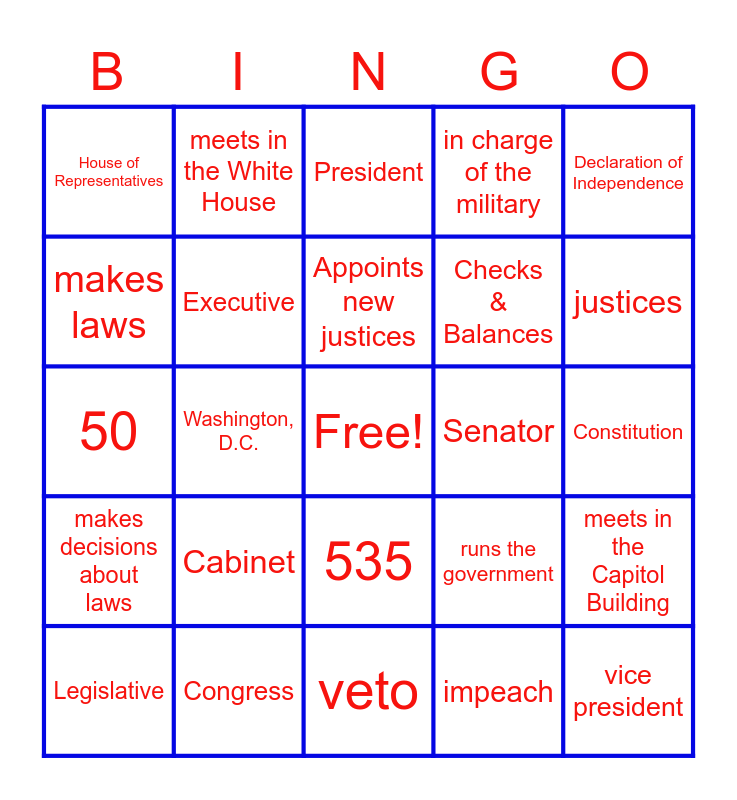 This bingo card has a free space and 29 words: Legislative, Judicial, Washington, D.C., Supreme Court, House of Representatives, President, Executive, Cabinet, Senator, Congress, Constitution, vice president, veto, impeach, justices, law, 535, makes decisions about laws, Declaration of Independence, 50, runs the government, 100, Checks & Balances, makes laws, in charge of the military, meets in the White House, meets in the Capitol Building, Appoints new justices and Commander-in-Chief.
