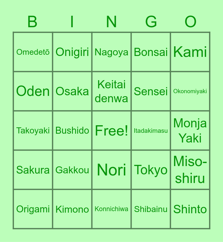 This bingo card has a free space and 27 words: Tokyo, Sora, Sensei, Konnichiwa, Oden, Nagoya, Onigiri, Sakura, Itadakimasu, Miso-shiru, Takoyaki, Bonsai, Origami, Kimono, Okonomiyaki, Tsukiji, Osaka, Keitai denwa, Gakkou, Omedetō, Monja Yaki, Shibainu, Bushido, Shinto, Nori, Kami and Hai.