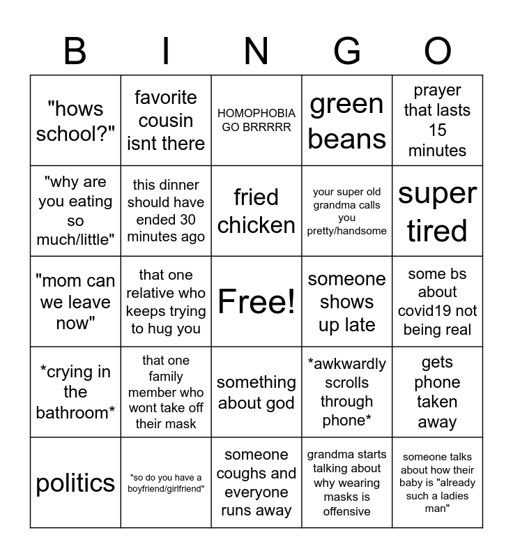 This bingo card has a free space and 24 words: that one family member who wont take off their mask, "so do you have a boyfriend/girlfriend", fried chicken, politics, prayer that lasts 15 minutes, "hows school?", "why are you eating so much/little", favorite cousin isnt there, someone shows up late, something about god, your super old grandma calls you pretty/handsome, "mom can we leave now", *awkwardly scrolls through phone*, gets phone taken away, this dinner should have ended 30 minutes ago, grandma starts talking about why wearing masks is offensive, some bs about covid19 not being real, HOMOPHOBIA GO BRRRRR, super tired, that one relative who keeps trying to hug you, someone talks about how their baby is "already such a ladies man", *crying in the bathroom*, green beans and someone coughs and everyone runs away.