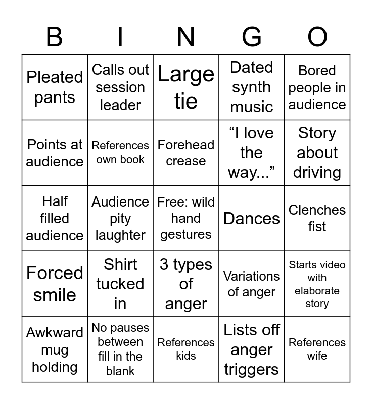 This bingo card has a free space and 29 words: Awkward mug holding, Hand in pocket, Audience pity laughter, Family sleeping story, Pleated pants, Large tie, References own book, Shirt tucked in, Dances, No pauses between fill in the blank, Clenches fist, References wife, References kids, Lists off anger triggers, Story about driving, “Car”, 3 types of anger, Forced smile, Bored people in audience, Half filled audience, Variations of anger, Asks rhetorical questions, “I love the way...”, Points at audience, Dated synth music, Calls out session leader, Starts video with elaborate story, Forehead crease and Classic white boomer awkwardness.