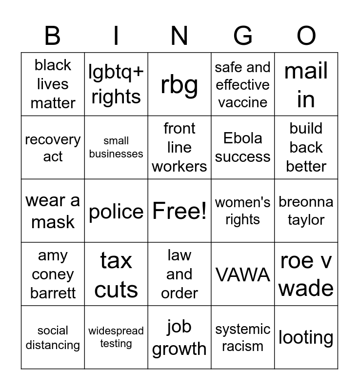 This bingo card has a free space and 27 words: VAWA, ACA, Ebola success, job growth, recovery act, rbg, lgbtq+ rights, amy coney barrett, women's rights, roe v wade, wear a mask, safe and effective vaccine, social distancing, widespread testing, build back better, expand middle class, small businesses, front line workers, tax cuts, black lives matter, breonna taylor, systemic racism, police, looting, law and order, mail in and voter registration.