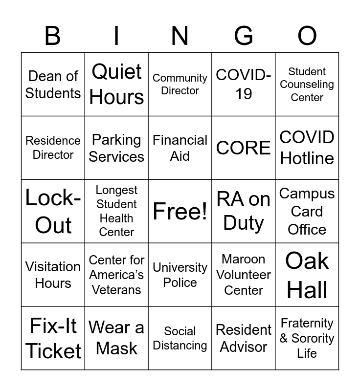 This bingo card has a free space and 28 words: Oak Hall, Magnolia Hall, CORE, Resident Advisor, Residence Director, Community Director, Quiet Hours, Visitation Hours, RA on Duty, Fix-It Ticket, Lock-Out, COVID-19, Wear a Mask, Social Distancing, COVID Hotline, Sanderson Center, Center for America’s Veterans, Parking Services, Financial Aid, University Police, Dean of Students, Holmes Cultural Diversity Center, Fraternity & Sorority Life, Longest Student Health Center, Campus Card Office, Maroon Volunteer Center, Student Counseling Center and Student Success Center.