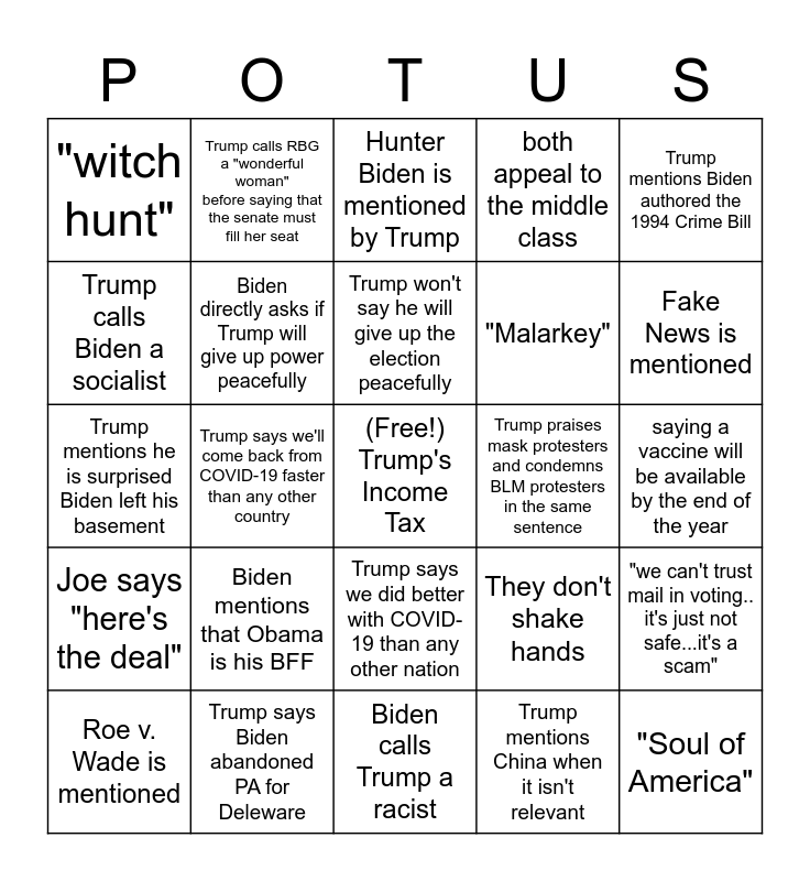 This bingo card has a free space and 27 words: They don't shake hands, Biden tells Trump to stop tweeting, "Malarkey", Biden calls Trump a racist, Trump calls Biden a socialist, Hunter Biden is mentioned by Trump, Trump calls RBG a "wonderful woman" before saying that the senate must fill her seat, Joe says "here's the deal", Trump praises mask protesters and condemns BLM protesters in the same sentence, "we can't trust mail in voting.. it's just not safe...it's a scam", Trump mentions he is surprised Biden left his basement, both appeal to the middle class, Roe v. Wade is mentioned, Trump says Biden abandoned PA for Deleware, Fake News is mentioned, "Radical Left", Biden directly asks if Trump will give up power peacefully, Trump won't say he will give up the election peacefully, Biden mentions that Obama is his BFF, "witch hunt", saying a vaccine will be available by the end of the year, Trump mentions China when it isn't relevant, Trump says we'll come back from COVID-19 faster than any other country, "Soul of America", Trump says we did better with COVID-19 than any other nation, Trump mentions Biden authored the 1994 Crime Bill and Trump is fact checked by the moderator.