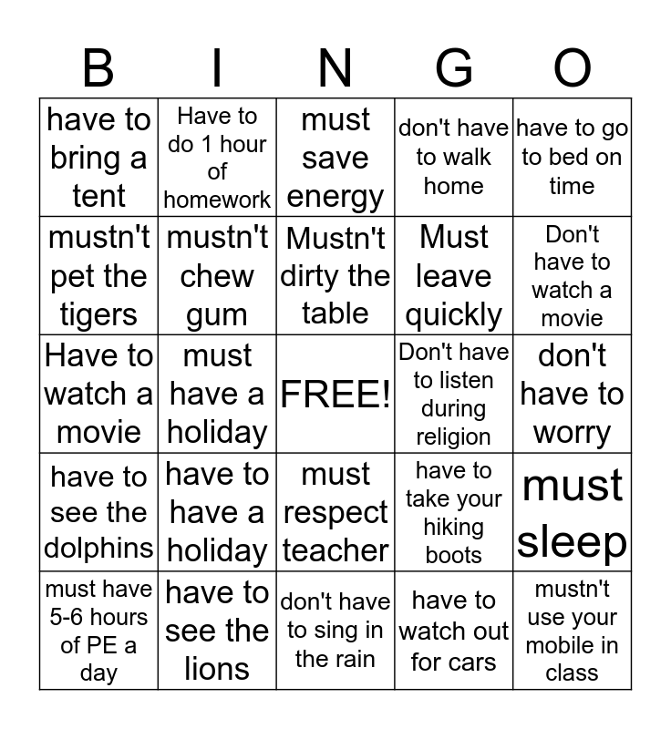 This bingo card has a free space and 24 words: have to have a holiday, have to see the lions, Mustn't dirty the table, must have 5-6 hours of PE a day, have to go to bed on time, have to bring a tent, mustn't pet the tigers, Have to do 1 hour of homework, Don't have to listen during religion, must respect teacher, Must leave quickly, Have to watch a movie, have to take your hiking boots, must sleep, mustn't chew gum, have to watch out for cars, don't have to worry, must save energy, Don't have to watch a movie, must have a holiday, mustn't use your mobile in class, have to see the dolphins, don't have to walk home and don't have to sing in the rain.