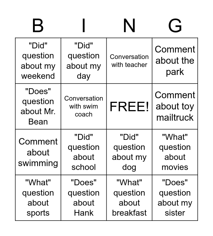 This bingo card has 16 words: "Does" question about Hank, "What" question about movies, Conversation with teacher, "Did" question about my weekend, Comment about swimming, "Did" question about my day, "Did" question about my dog, "What" question about breakfast, "Does" question about Mr. Bean, Conversation with swim coach, "What" question about sports, Comment about the park, "Did" question about school, Comment about toy mailtruck, FREE! and "Does" question about my sister.