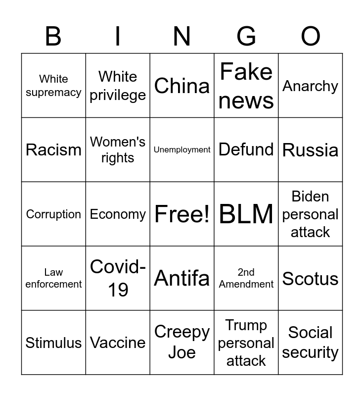 This bingo card has a free space and 24 words: Covid-19, Vaccine, Unemployment, Stimulus, Anarchy, White supremacy, Racism, White privilege, BLM, Antifa, Defund, Corruption, 2nd Amendment, Scotus, Women's rights, Trump personal attack, Biden personal attack, China, Russia, Economy, Social security, Law enforcement, Fake news and Creepy Joe.