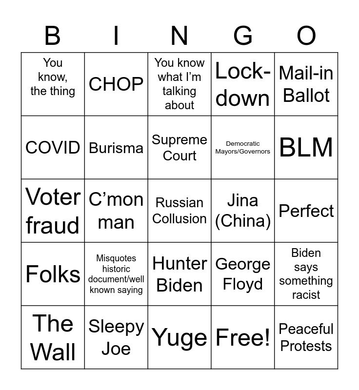 This bingo card has 30 words: Sleepy Joe, Look, C’mon man, Almost out of time, You know, the thing, You know what I’m talking about, Burisma, Hunter Biden, Jina (China), Yuge, Perfect, Russian Collusion, Free!, Peaceful Protests, BLM, Riots, George Floyd, Folks, Misquotes historic document/well known saying, Mail-in Ballot, Voter fraud, Systemic Racism, CHOP, Democratic Mayors/Governors, COVID, Lock-down, Biden says something racist, The Wall, Supreme Court and Impeachment.