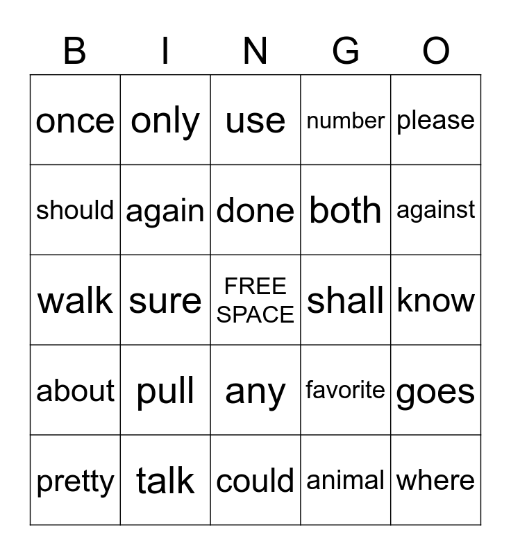 This bingo card has a free space and 24 words: pull, talk, done, pretty, please, once, should, only, shall, any, both, walk, favorite, goes, again, animal, know, use, against, sure, where, about, number and could.