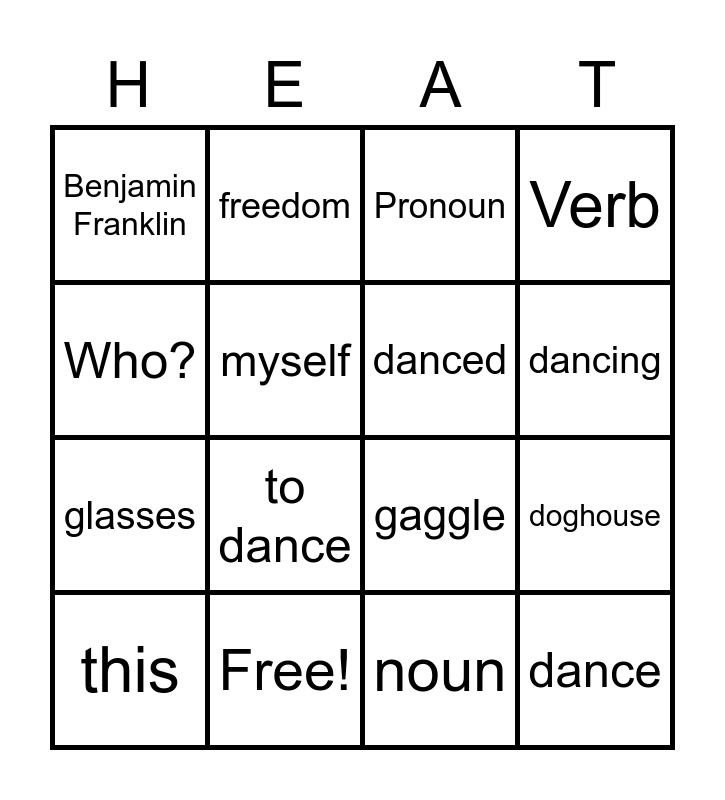 This bingo card has 16 words: Free!, doghouse, Pronoun, Benjamin Franklin, glasses, freedom, gaggle, noun, Who?, myself, this, Verb, to dance, dancing, danced and dance.