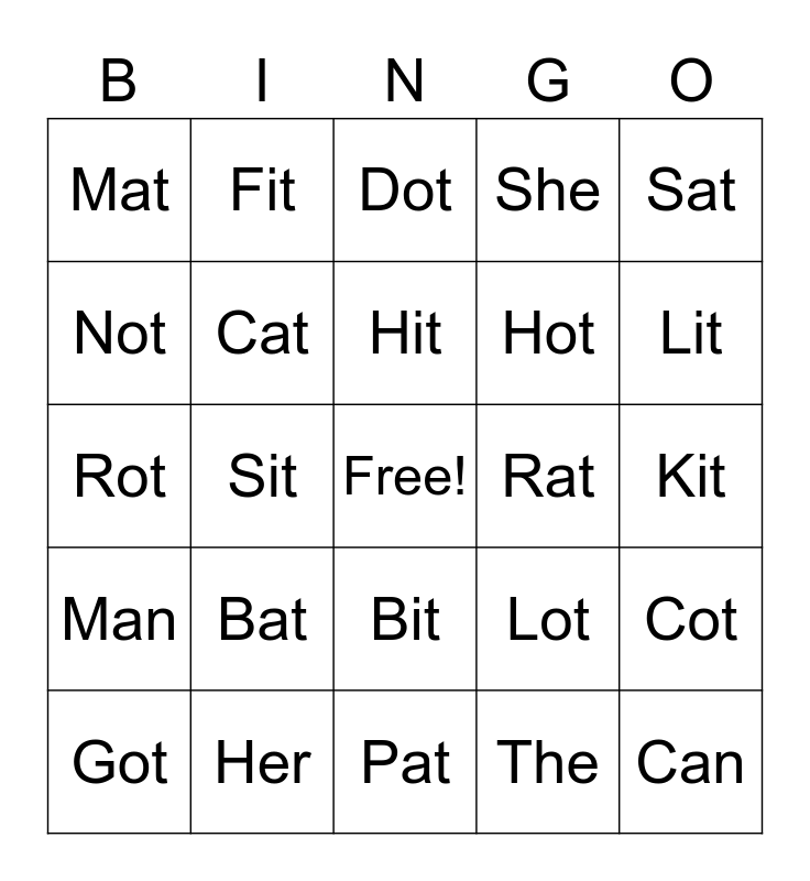 This bingo card has a free space and 25 words: Bat, Pat, Hit, Got, Sat, Mat, Not, Fit, Rat, Bit, Hot, Rot, Lot, Cot, Cat, Hat, Kit, Dot, Lit, Sit, Can, Her, Man, She and The.