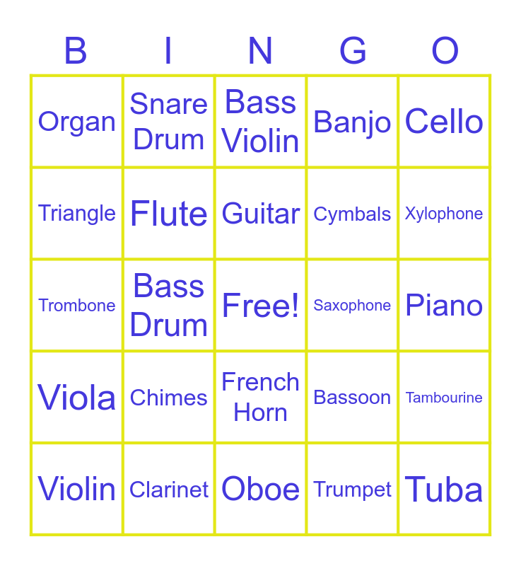 This bingo card has a free space and 24 words: Chimes, Clarinet, Guitar, Violin, Cello, Organ, Triangle, Snare Drum, Saxophone, French Horn, Cymbals, Trombone, Bassoon, Tambourine, Flute, Trumpet, Piano, Bass Violin, Xylophone, Bass Drum, Tuba, Viola, Banjo and Oboe.