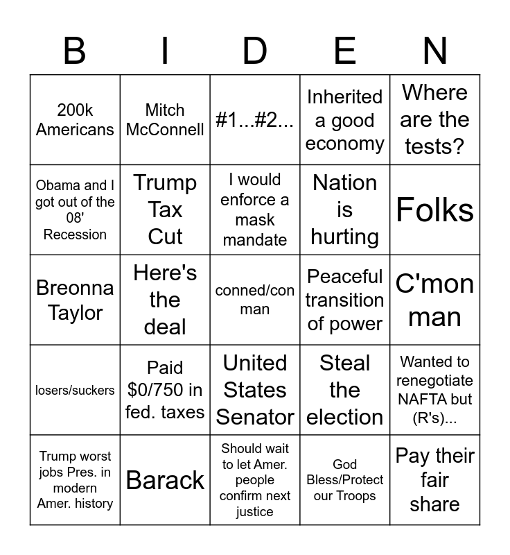 This bingo card has 25 words: Paid $0/750 in fed. taxes, Should wait to let Amer. people confirm next justice, I would enforce a mask mandate, Trump worst jobs Pres. in modern Amer. history, Where are the tests?, 200k Americans, Obama and I got out of the 08' Recession, Mitch McConnell, Peaceful transition of power, United States Senator, Nation is hurting, Breonna Taylor, Steal the election, Wanted to renegotiate NAFTA but (R's)..., Trump Tax Cut, Pay their fair share, C'mon man, #1...#2..., Folks, Here's the deal, conned/con man, Barack, losers/suckers, Inherited a good economy and God Bless/Protect our Troops.