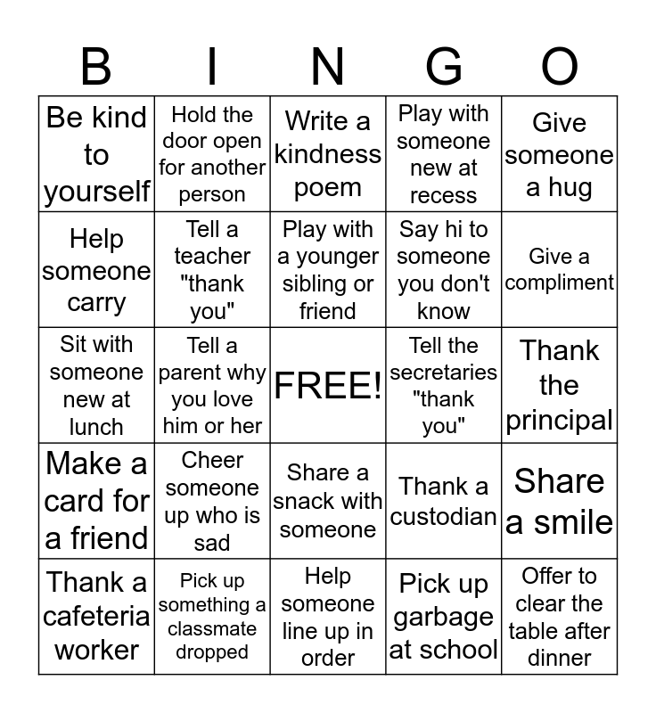 This bingo card has a free space and 24 words: Cheer someone up who is sad, Pick up something a classmate dropped, Play with a younger sibling or friend, Thank a cafeteria worker, Give someone a hug, Be kind to yourself, Help someone carry, Hold the door open for another person, Tell the secretaries "thank you", Share a snack with someone, Say hi to someone you don't know, Sit with someone new at lunch, Thank a custodian, Share a smile, Tell a teacher "thank you", Pick up garbage at school, Thank the principal, Write a kindness poem, Give a compliment, Tell a parent why you love him or her, Offer to clear the table after dinner, Make a card for a friend, Play with someone new at recess and Help someone line up in order.