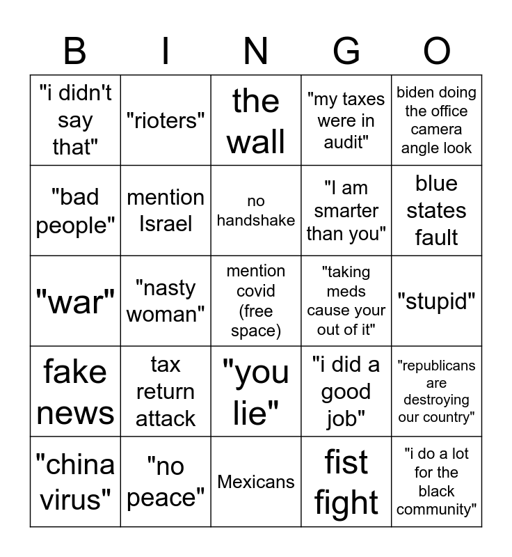 This bingo card has a free space and 24 words: "china virus", tax return attack, no handshake, fist fight, biden doing the office camera angle look, "i didn't say that", "rioters", the wall, "taking meds cause your out of it", "stupid", "war", mention Israel, "i did a good job", "republicans are destroying our country", "bad people", "no peace", Mexicans, "my taxes were in audit", blue states fault, fake news, "nasty woman", "you lie", "I am smarter than you" and "i do a lot for the black community".