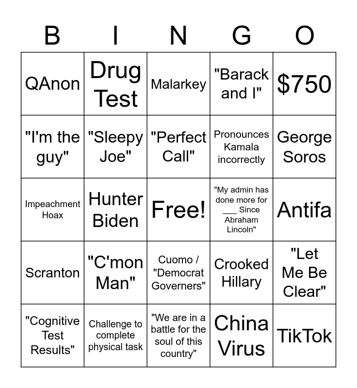 This bingo card has a free space and 25 words: "C'mon Man", "We are in a battle for the soul of this country", "Perfect Call", "Cognitive Test Results", $750, QAnon, "I'm the guy", Drug Test, "My admin has done more for ___ Since Abraham Lincoln", Cuomo / "Democrat Governers", Pronounces Kamala incorrectly, Impeachment Hoax, Crooked Hillary, "Let Me Be Clear", "Sleepy Joe", Law And Order, Antifa, Malarkey, George Soros, Hunter Biden, TikTok, Challenge to complete physical task, Scranton, "Barack and I" and China Virus.