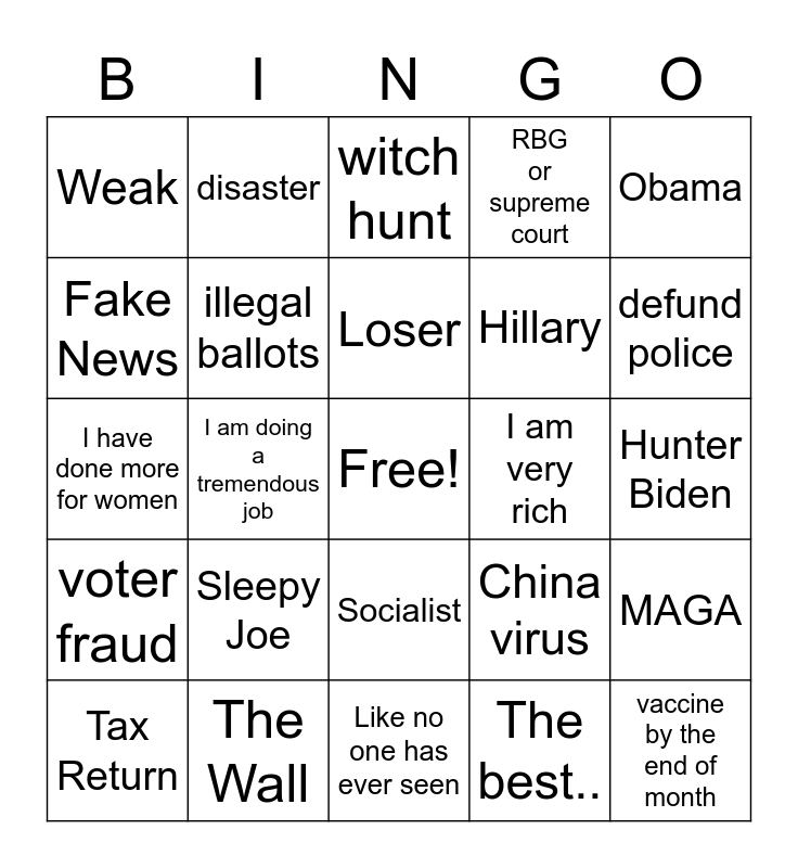 This bingo card has a free space and 24 words: Sleepy Joe, The Wall, Loser, Tax Return, Obama, Weak, Fake News, disaster, I am very rich, Socialist, Hillary, I have done more for women, China virus, MAGA, illegal ballots, The best.., Hunter Biden, witch hunt, defund police, I am doing a tremendous job, vaccine by the end of month, voter fraud, RBG or supreme court and Like no one has ever seen.
