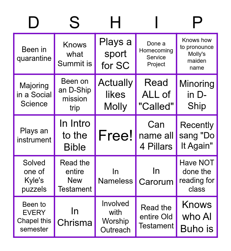 This bingo card has a free space and 24 words: Read the entire New Testament, In Chrisma, Actually likes Molly, Been to EVERY Chapel this semester, Knows how to pronounce Molly's maiden name, Been in quarantine, Majoring in a Social Science, Knows what Summit is, Can name all 4 Pillars, In Nameless, Read ALL of "Called", Plays an instrument, In Carorum, Have NOT done the reading for class, Been on an D-Ship mission trip, Read the entire Old Testament, Recently sang "Do It Again", Plays a sport for SC, Minoring in D-Ship, In Intro to the Bible, Knows who Al Buho is, Solved one of Kyle's puzzels, Done a Homecoming Service Project and Involved with Worship Outreach.