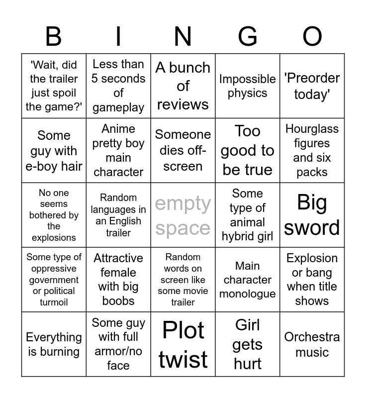 This bingo card has a free space and 24 words: Attractive female with big boobs, Some guy with full armor/no face, Someone dies off-screen, Everything is burning, 'Preorder today', 'Wait, did the trailer just spoil the game?', Some guy with e-boy hair, Less than 5 seconds of gameplay, Some type of animal hybrid girl, Random words on screen like some movie trailer, Too good to be true, No one seems bothered by the explosions, Main character monologue, Explosion or bang when title shows, Anime pretty boy main character, Girl gets hurt, Big sword, A bunch of reviews, Hourglass figures and six packs, Random languages in an English trailer, Orchestra music, Some type of oppressive government or political turmoil, Impossible physics and Plot twist.