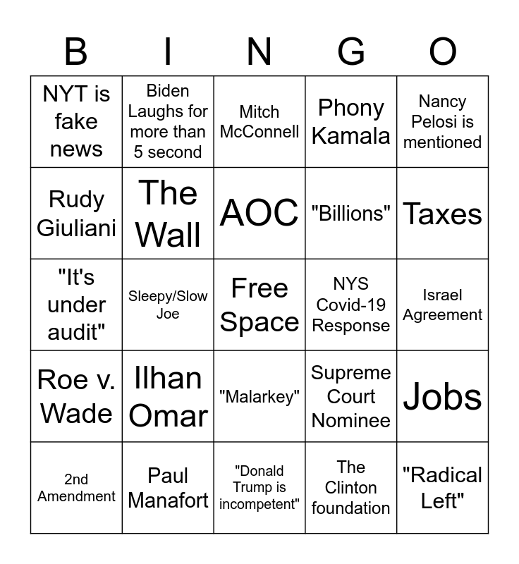 This bingo card has a free space and 34 words: "Wrong", The Clinton foundation, Impeachment, Trump doesn't shake hand, Roe v. Wade, The Wall, Nancy Pelosi is mentioned, 2nd Amendment, Biden Laughs for more than 5 second, Raise Taxes, AOC, Mitch McConnell, Voter Suppression, GOP, NYS Covid-19 Response, Taxes, Paul Manafort, "It's under audit", Ilhan Omar, Supreme Court Nominee, "Malarkey", Crazy Bernie, NYT is fake news, Israel Agreement, "Donald Trump is incompetent", "Radical Left", Phony Kamala, BLM as "Riots", "Billions", Rudy Giuliani, Chuck Schumer, Sleepy/Slow Joe, Jobs and Pennsylvania.