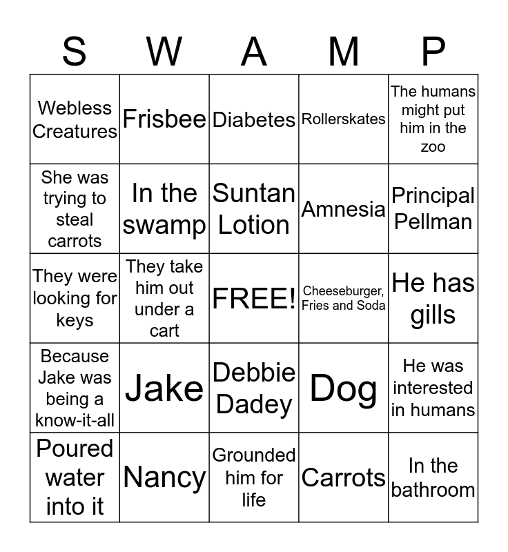 This bingo card has a free space and 24 words: Jake, Nancy, Suntan Lotion, Poured water into it, The humans might put him in the zoo, Webless Creatures, She was trying to steal carrots, Frisbee, Cheeseburger, Fries and Soda, Debbie Dadey, Amnesia, They were looking for keys, Dog, He was interested in humans, In the swamp, Carrots, He has gills, Diabetes, Principal Pellman, They take him out under a cart, In the bathroom, Because Jake was being a know-it-all, Rollerskates and Grounded him for life.