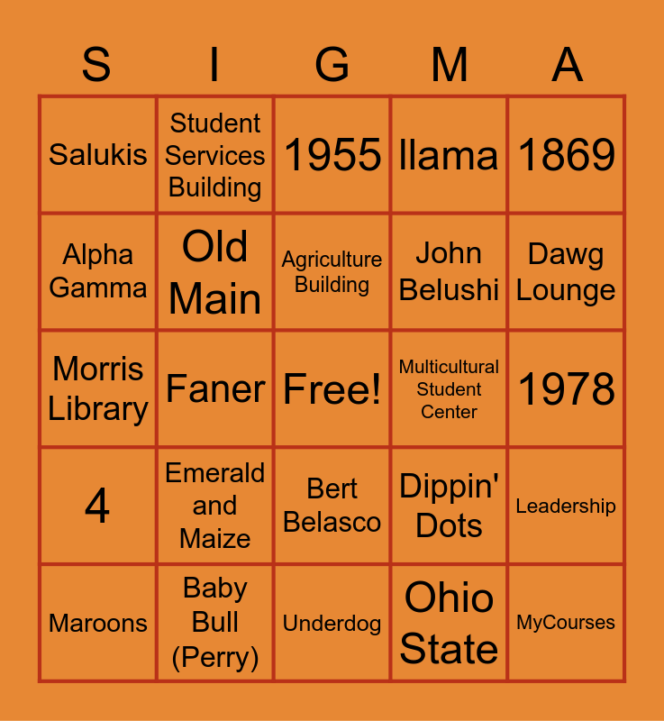 This bingo card has a free space and 24 words: Emerald and Maize, Baby Bull (Perry), Agriculture Building, Maroons, 1869, Salukis, Alpha Gamma, Student Services Building, Multicultural Student Center, Bert Belasco, John Belushi, Morris Library, Dippin' Dots, Leadership, Old Main, Ohio State, 1978, 1955, Dawg Lounge, Faner, MyCourses, 4, llama and Underdog.