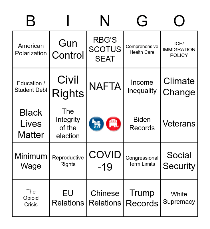 This bingo card has a free space and 24 words: Reproductive Rights, EU Relations, NAFTA, The Opioid Crisis, ICE/ IMMIGRATION POLICY, American Polarization, Education / Student Debt, Gun Control, Biden Records, COVID -19, Income Inequality, Black Lives Matter, Congressional Term Limits, Social Security, Civil Rights, Trump Records, Veterans, RBG’S SCOTUS SEAT, Climate Change, The Integrity of the election, White Supremacy, Minimum Wage, Comprehensive Health Care and Chinese Relations.