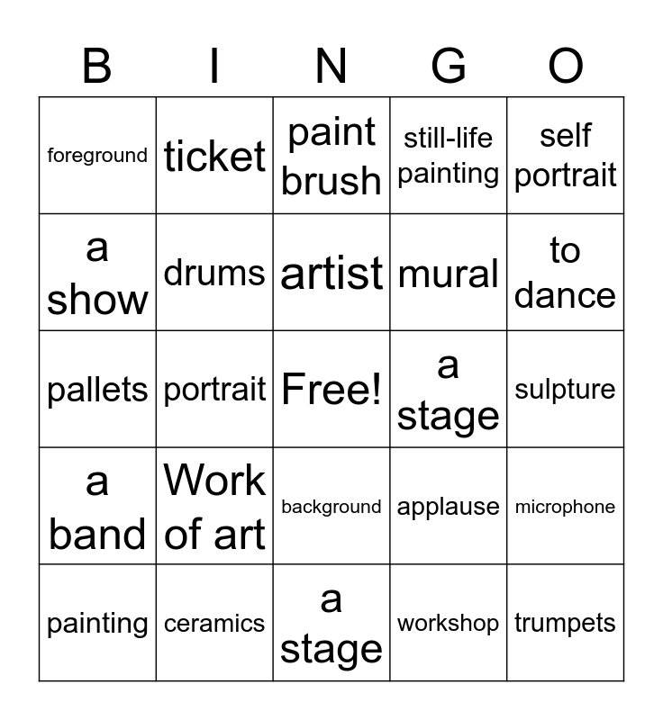 This bingo card has a free space and 24 words: Work of art, ceramics, artist, painting, self portrait, foreground, a show, ticket, a stage, background, mural, pallets, applause, microphone, drums, workshop, sulpture, paint brush, to dance, portrait, trumpets, a band, still-life painting and a stage.