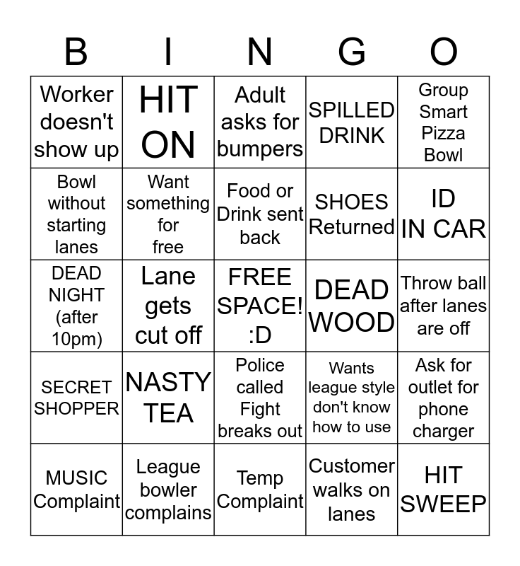 This bingo card has a free space and 24 words: NASTY TEA, League bowler complains, Food or Drink sent back, MUSIC Complaint, Group Smart Pizza Bowl, Worker doesn't show up, Bowl without starting lanes, HIT ON, DEAD WOOD, Police called Fight breaks out, SHOES Returned, DEAD NIGHT (after 10pm), Wants league style don't know how to use, Ask for outlet for phone charger, Want something for free, Customer walks on lanes, Throw ball after lanes are off, Adult asks for bumpers, ID IN CAR, Lane gets cut off, HIT SWEEP, SECRET SHOPPER, SPILLED DRINK and Temp Complaint.