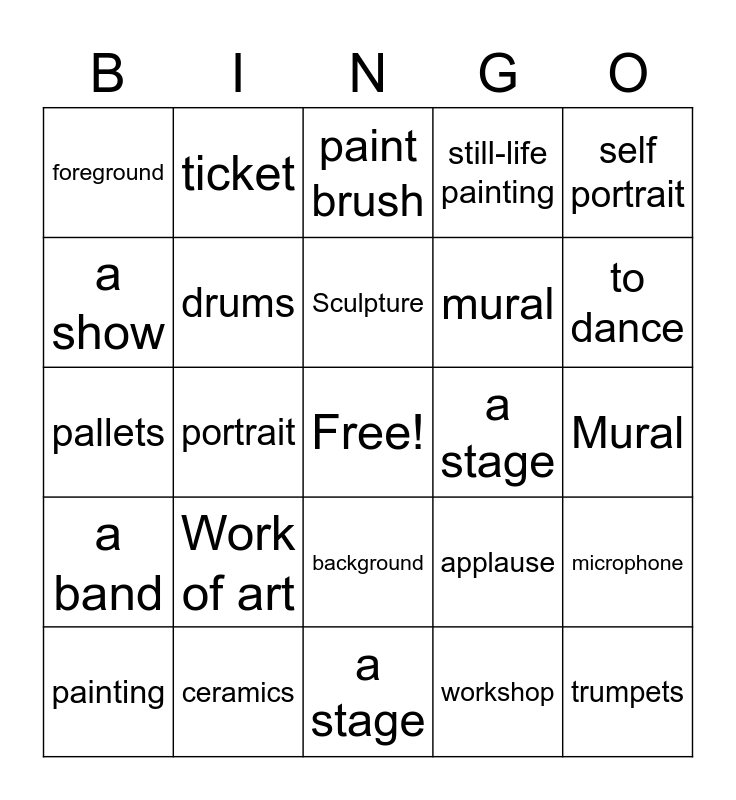 This bingo card has a free space and 24 words: Work of art, ceramics, Sculpture, painting, self portrait, foreground, a show, ticket, a stage, background, mural, pallets, applause, microphone, drums, workshop, Mural, paint brush, to dance, portrait, trumpets, a band, still-life painting and a stage.