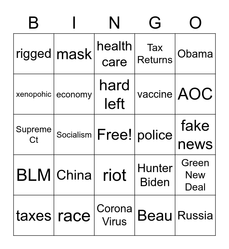 This bingo card has a free space and 24 words: China, race, hard left, taxes, Obama, rigged, xenopohic, mask, police, riot, vaccine, Supreme Ct, Hunter Biden, Green New Deal, economy, Beau, fake news, health care, AOC, Socialism, Russia, BLM, Tax Returns and Corona Virus.
