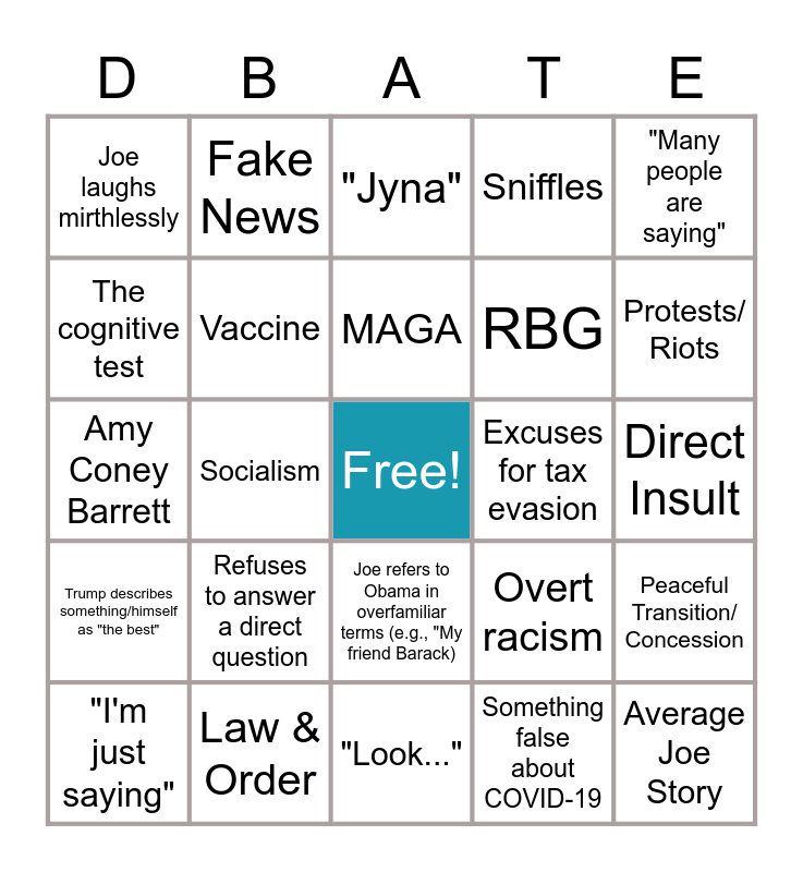 This bingo card has a free space and 54 words: "Sleepy Joe", Trump describes something/himself as "the best", Joe tells a sad story, "China Virus" or blames China for COVID-2, Joe refers to Obama in overfamiliar terms (e.g., "My friend Barack), Something physically awkward, Sniffles, "I was treated very unfairly", The cognitive test, Hunter Biden, Joe laughs mirthlessly, "Believe me", Law & Order, "I'm just saying", Voter Fraud, "Look...", Average Joe Story, RBG, "With all due respect", Direct Insult, Overt racism, Indecipherable, Excuses for tax evasion, "Many people are saying", Hoax, Fake News, Lie, "Anarchy", "Folks,...", Something false about COVID-19, Biden misuses a similar word (malapropism), The longest anecdote ever, Voter Fraud, "Yuge", "Jyna", Post Office, Amy Coney Barrett, Peaceful Transition/ Concession, Rigged, Vaccine, Russia/ Putin, Antifa, Black Lives Matter, Domestic "terrorists", Refuses to answer a direct question, "a disaster", "We'll see what happens", Build Back Better, MAGA, Socialism, Protests/ Riots, Something creepy about women, Refers to self in third person and Great Economy.