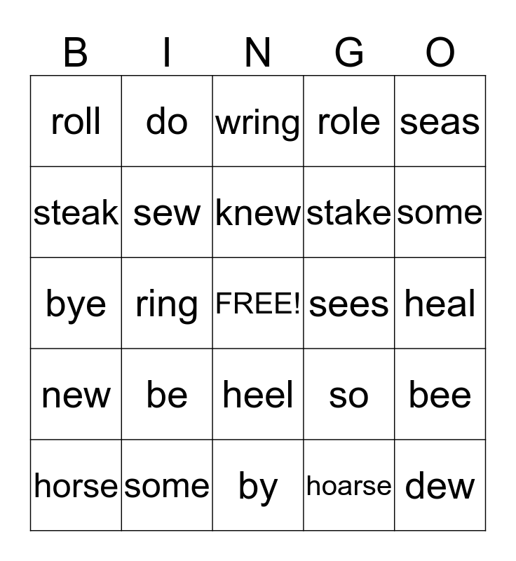This bingo card has a free space and 24 words: be, some, knew, horse, seas, roll, steak, do, sees, heel, stake, bye, so, bee, sew, hoarse, heal, wring, some, ring, dew, new, role and by.